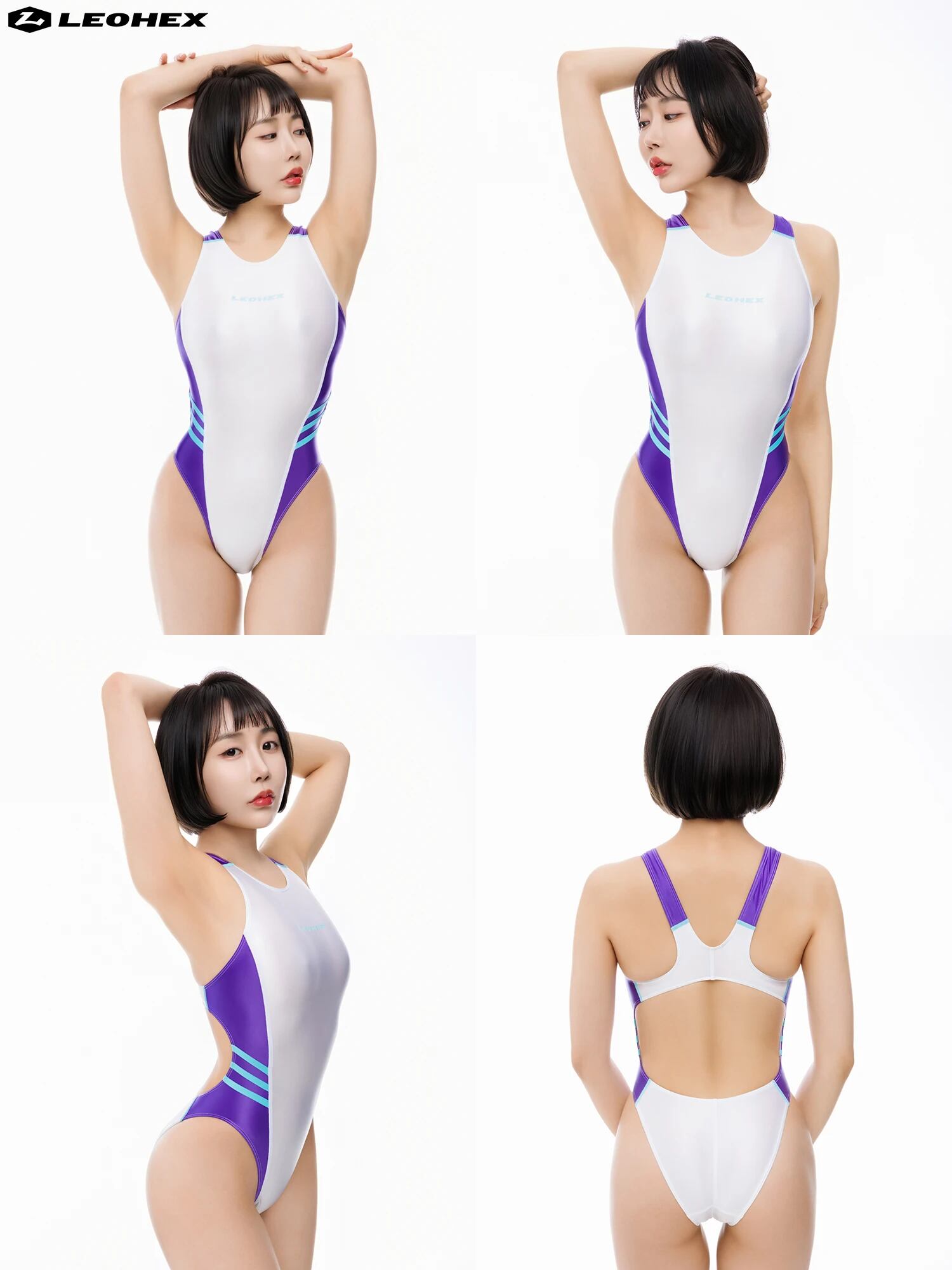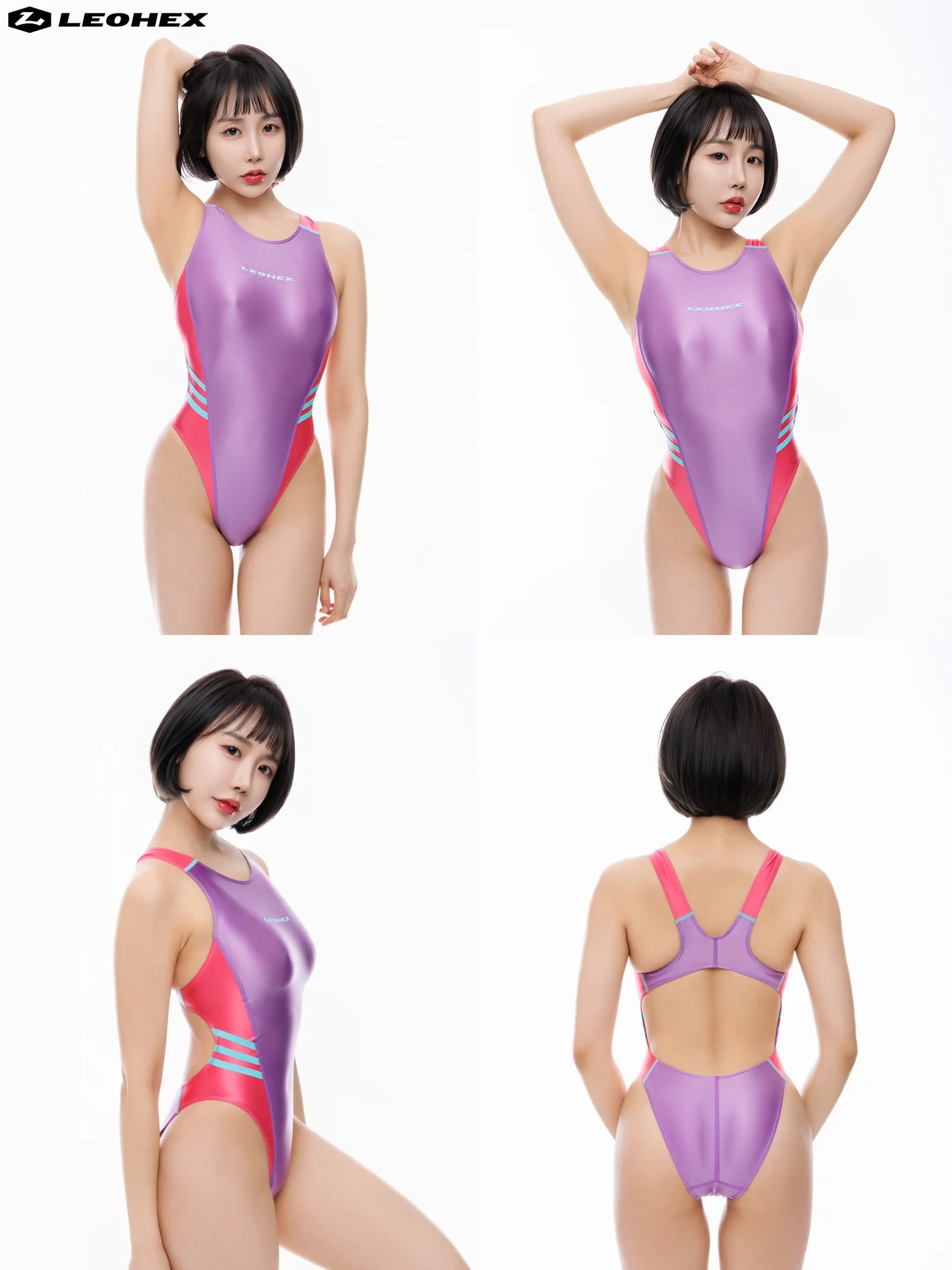 艶やかで美しい光沢が動きに合わせてきらめき、ステージでもプールでも視線を引きつける存在感。LEOHEXならではの高品質ファブリックを使用
